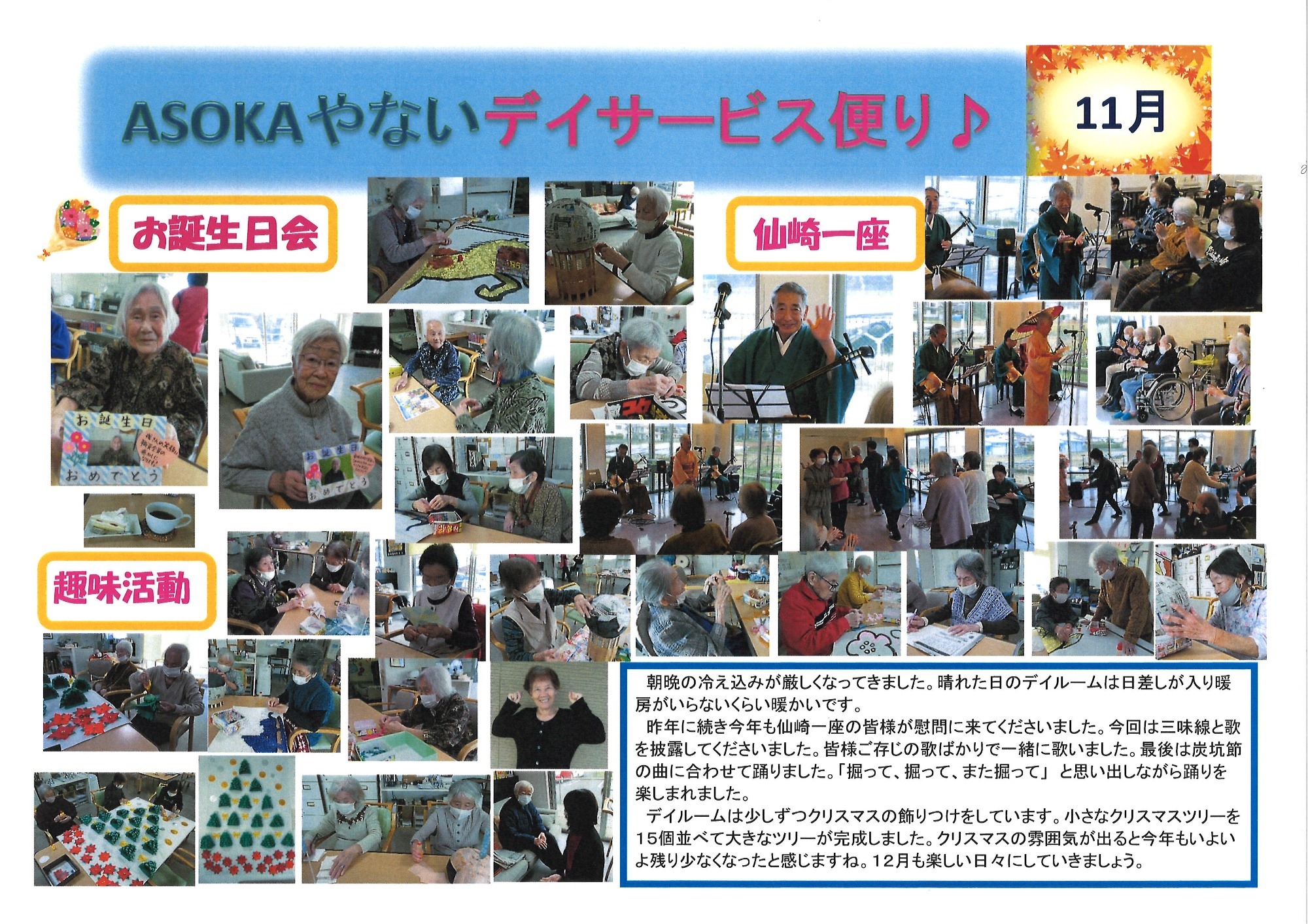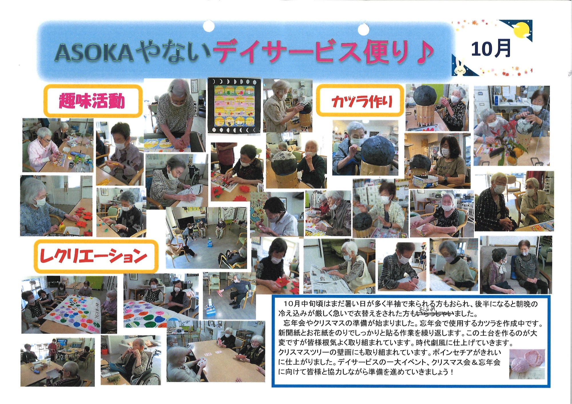 | 内容 | 入浴、昼食、排せつ介助、機能訓練、趣味(生け花、囲碁など)・レクリエーション、健康チェックなど |