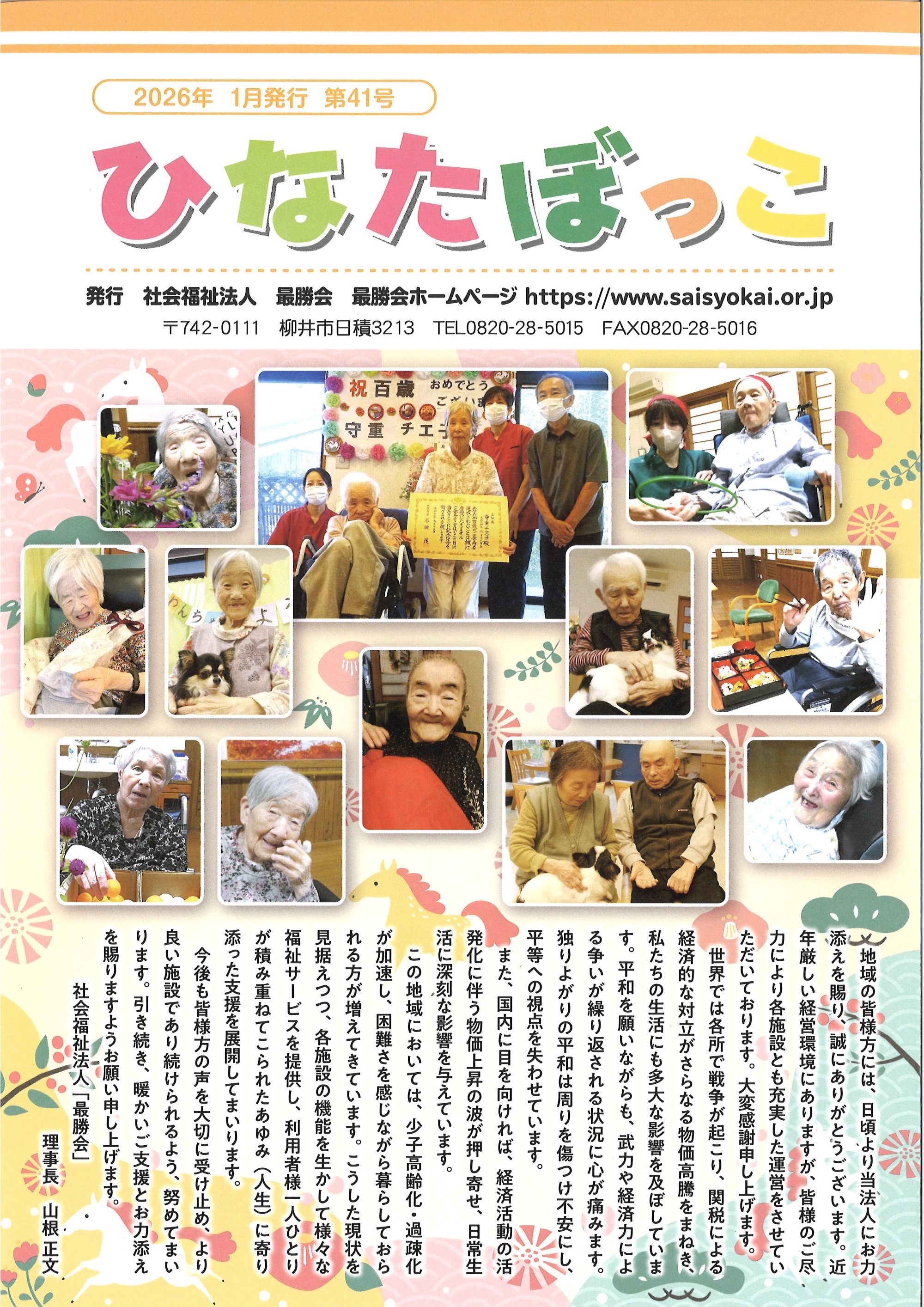 最勝会の広報誌『ひなたぼっこ』は、入居者や利用者の様子を、家族や地域の方々にお伝えする目的で年二回発行しております。ご感想をお寄せください。